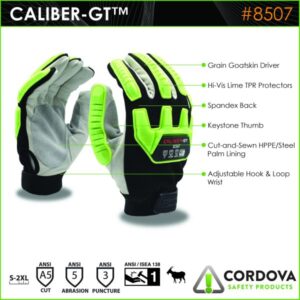 This CALIBER-GT™ features soft grain goatskin leather with ANSI Cut Level A5 protection. The unique cut & sewn HPPE/Steel linings match the construction of the leather outer providing better comfort and flexibility. Unlike some aramid-based linings, CORDOVA’s HPPE/Steel linings are cool-to-the-touch and hands slide in and out easily without pulling out the liner. It is equipped with hi-vis lime TPR protectors for greater impact protection and visibility and features an adjustable wrist strap and keystone thumb. The CALIBER-GT meets ANSI Cut Level A5, ANSI Impact Level 1, ANSI Abrasion Level 5, and ANSI Puncture Level 4.